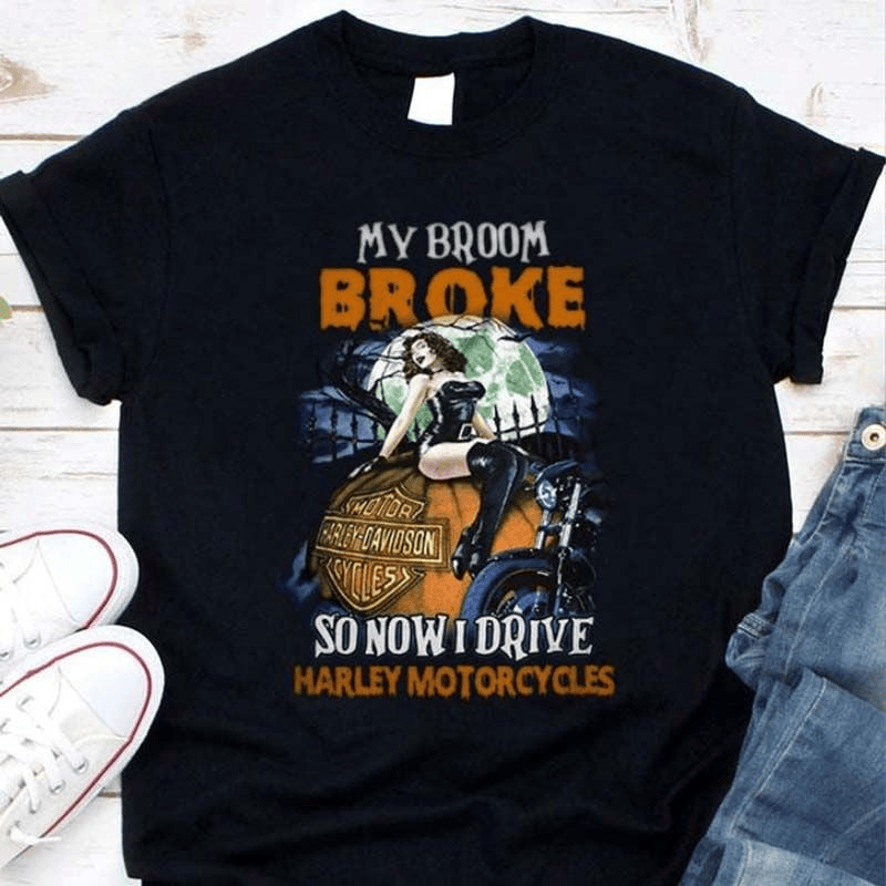 Harley Davidson My Broom Broke So Now I Drive Harley-Davidson Motorcycles Halloween T-shirt, Crew-neck Sweatshirt, Hoodie, Tank Top, V-neck T-shirt Design 2D Full Printed – NABC150