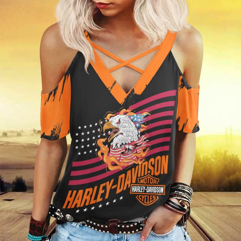 Harley Davidson Women’s Cold Shoulder T-shirt With Criss Cross Strips NALA12