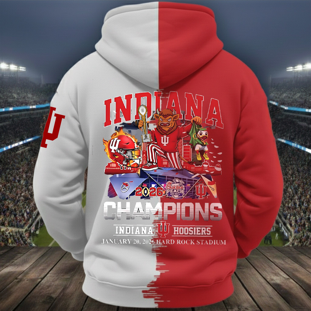 The Indiana Hoosiers champion designs feature strong team colors, iconic championship graphics, and bold typography that highlights the 2026 College Football Playoff victory. From all-over printed hoodies to premium sweatshirts, every detail reflects Hoosiers football legacy and the excitement of a championship moment.